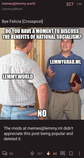 arrow-up12arrow-down1imagePosting a funny meme on instance Lemmygrad = ban from Lemmy World and hurt feelingsplus-squarethelemmy.clubCCPIsBased@thelemmy.clubM · 2 years agomessage-square0linkfedilink