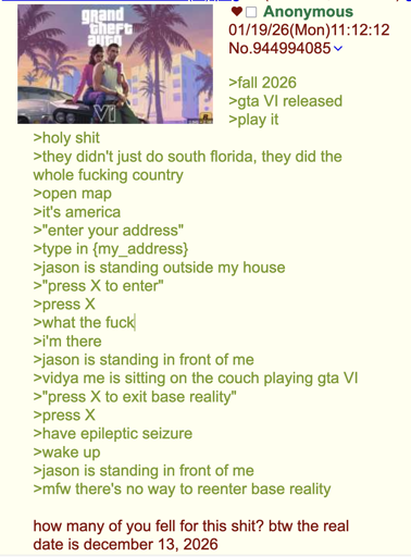 arrow-up1245arrow-down1imageAnon plays GTA VIlemmy.worldkali_fornication@lemmy.world to Greentext@sh.itjust.works · 26 days agomessage-square13linkfedilink