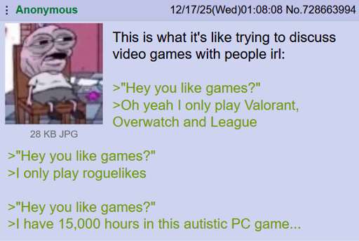 arrow-up1740arrow-down1imageAnon wants to talk about video gamessh.itjust.works🍹Early to RISA 🧉@sh.itjust.worksM to Greentext@sh.itjust.works · 23 days agomessage-square223linkfedilink