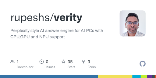 arrow-up18arrow-down1external-linkVerity,a Perplexity style AI search and answer engine that runs fully locally with CPU/GPU/NPU accelerationgithub.com☆ Yσɠƚԋσʂ ☆@lemmy.ml to Technology@lemmy.mlEnglish · 1 month agomessage-square7linkfedilink