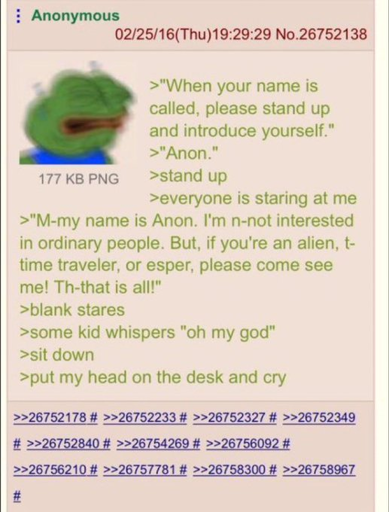 arrow-up1382arrow-down1imageAnon introduces himselfsh.itjust.works🍹Early to RISA 🧉@sh.itjust.worksM to Greentext@sh.itjust.works · 13 days agomessage-square87linkfedilink