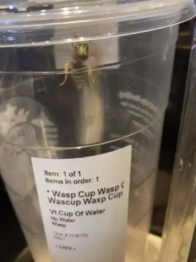 I do love the visual of a barista panicking about the wasp, but being unable to do anything about it until their coworker, who is also having a meltdown, types, prints, and applies the label to the cup before handing it to them to catch the wasp