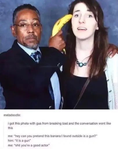 gus fring meme captioned: for you it's a banana. for me it's a gun. we are not the same