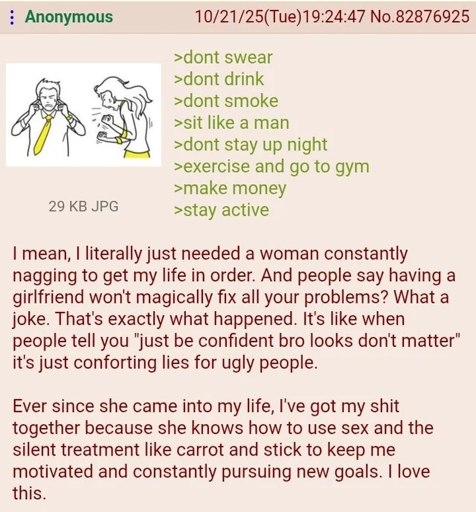 Having a partner in life makes a huge difference to motivation. I dont really agree with this idea of them leveraging things to force you to act that sounds like a living hell. These things should come naturally as you desire being the best version of yourself for your partner.