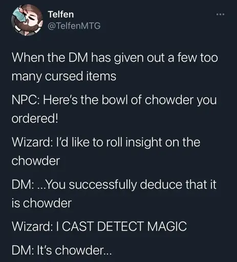 When I want that style of game, I play paranoia. I agree, that style of game CAN be fun! And sometimes I do want it! It’s just… there’s this whole awesome game based on it, that makes it work. DnD scratches an entirely different itch for me, and I’d rather keep it distinct.