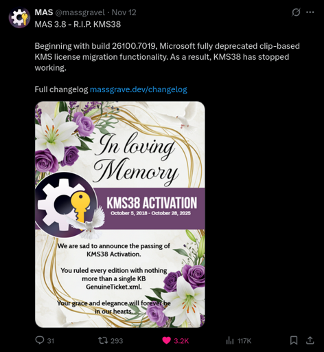 arrow-up1406arrow-down1imageMicrosoft has blocked Massgrave's KMS38 activation method for Windowslemmy.mlmr_MADAFAKA@lemmy.ml to Piracy: ꜱᴀɪʟ ᴛʜᴇ ʜɪɢʜ ꜱᴇᴀꜱ@lemmy.dbzer0.comEnglish · 28 days agomessage-square127linkfedilinkfile-text