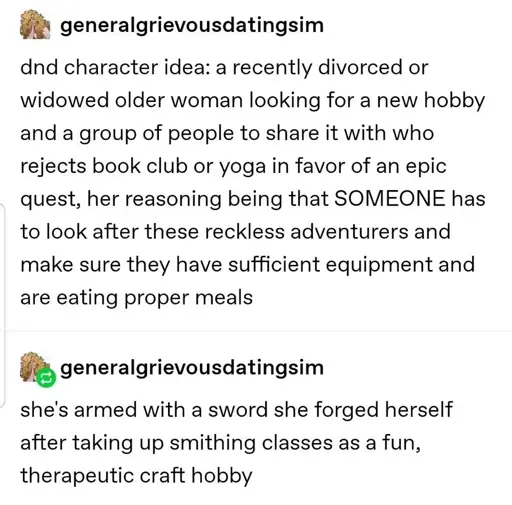 My mother joined me for a one-shot once and this is basically the character we rolled up for her. She was Nana Ylva, a human barbarian. Her thing was generally trying to solve things non-violently (often using her “Mom Voice” aka intimidation) but if she saw her “cubs” under attack she would rage. She had the chef feat that gave food with temp hp boosts. It was a fun little game and my mom still talks about it sometimes.