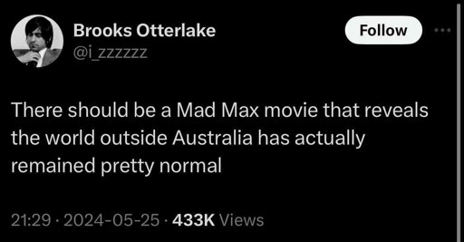 Whenever I play either fallout or the mad max game I like imagining the world outside the country the game focuses on to be going on business as usual, ignoring the anarchist apocalypse across the pond, which for some reason brings me great joy :3