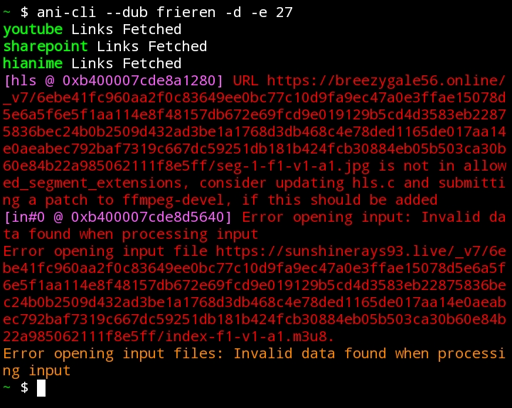 ani-cli -UI see that ani-cli prefer to use yt-dlp to ffmpeg if it’s available so you could try installing that too.